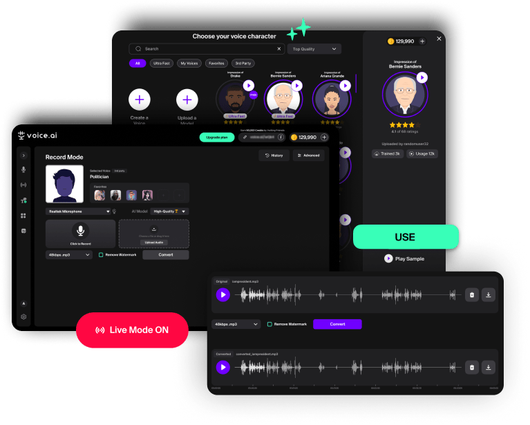 Change your voice real-time or transform any audio with collection of thousands AI voices.